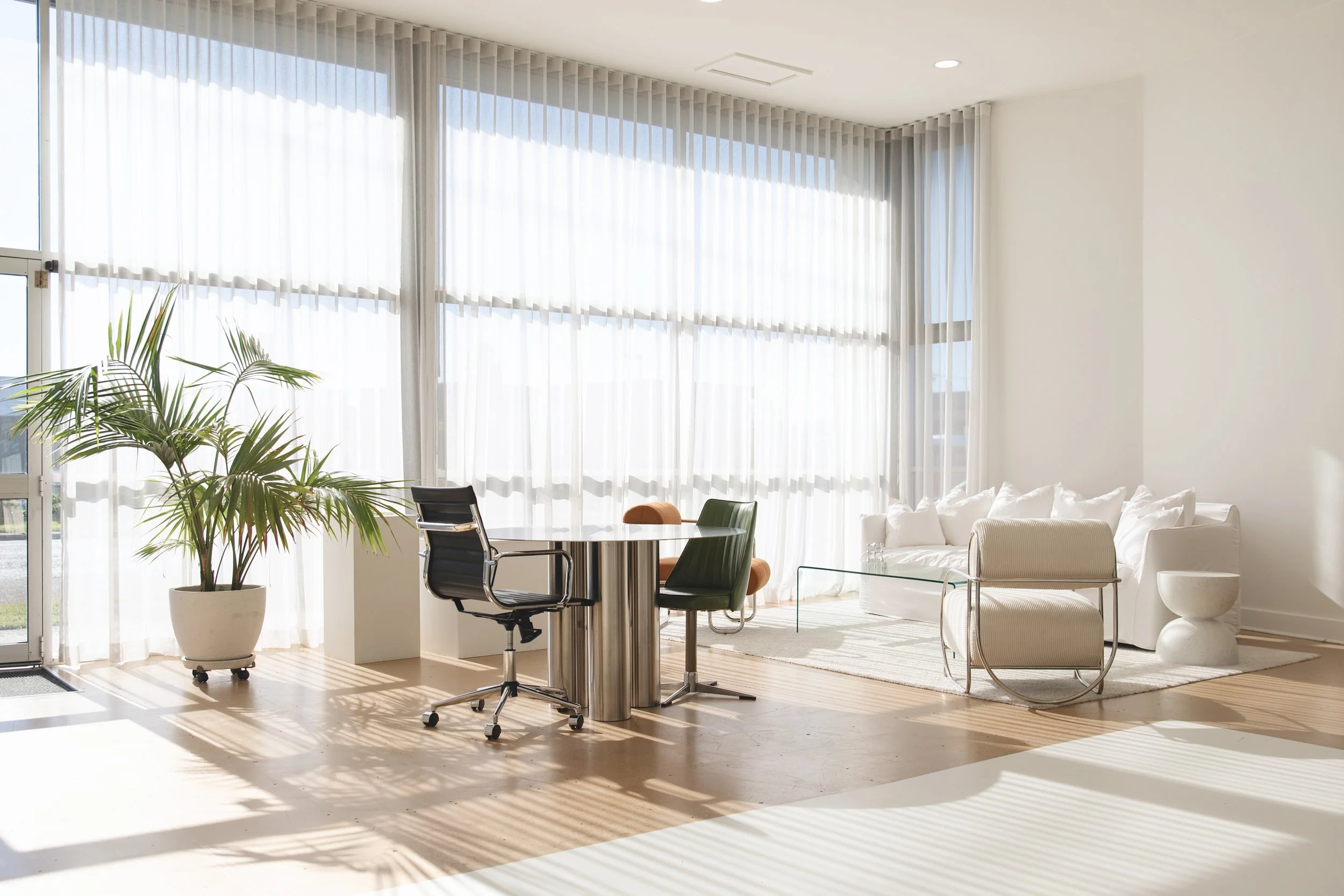 A thoughtfully styled content lounge with white floor-to-ceiling sheer curtains and Bauhaus-inspired furniture sets Everline Studios apart, offering an elevated environment for lifestyle content, interviews, and brand storytelling.